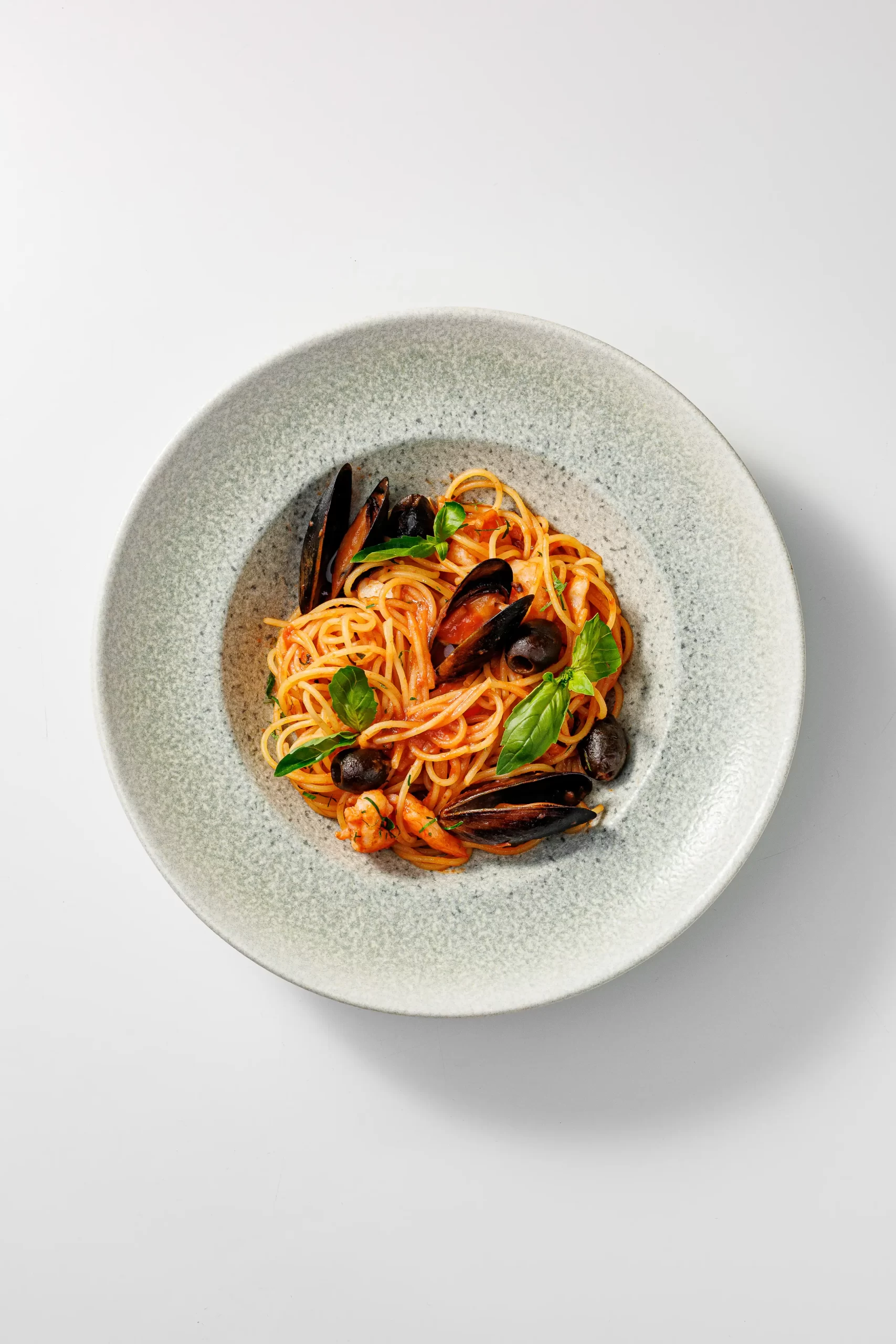 Креветки, кальмар, мидии, томатный соус, чили, маслины, чесночное масло, базилик (360)